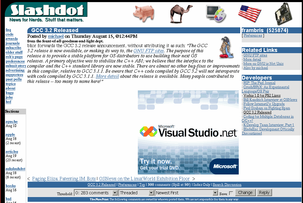 Cool screengrab I was just reading on slashdots developer column about the GCC 3.2 release and the banner I was hit with was a cool coincidence(??). GCC article and Visual Studio bannerGCC article and Visual Studio banner Share this: Click to share on X (Opens in new window) X Click to share on Facebook (Opens in new window) Facebook Like Loading... Related
