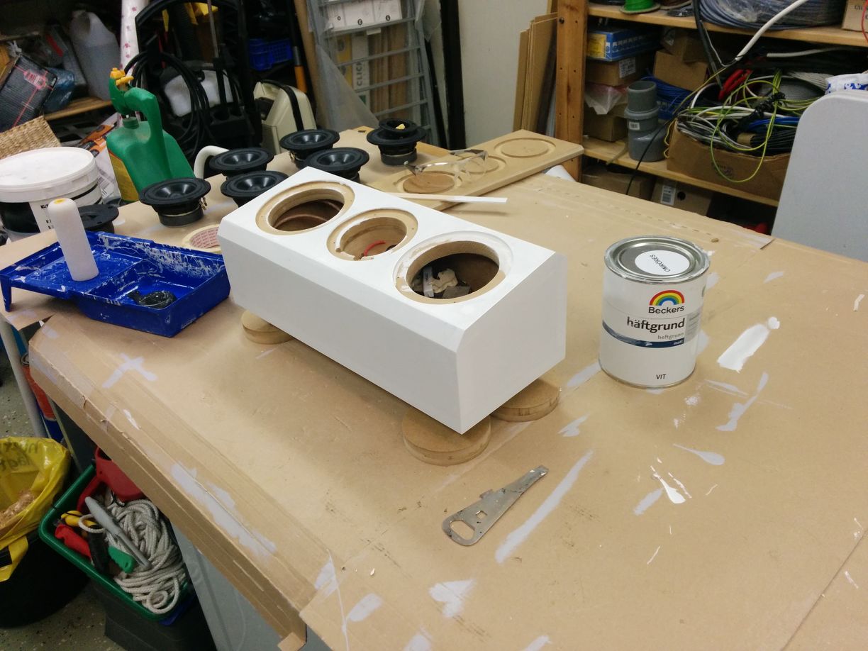 Luckily for me there were three separate filters. One highpass for the tweeter and two bandpass (if I remember correctly) where the one for the outer speakers cut of a bit lower than the front ones. I traced the wires from the speakers and found (and remembered) that when first built the phase was wrong on the tweeter and we had to switch phase a few times until we found out that it was the tweeter that was out of phase. The wires had been swapped on the filter and when connected according to the markings it became inverted. The filters were glued to the lower box which had a aluminium sheet at the bottom for some unknown reason (can’t fathom what difference it would make as it isn’t magnetic). Strong freaking construction adhesive. But with some careful chiseling I pryed them free.